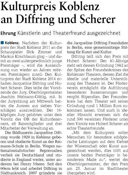 Koblenzer Kulturpreis 2014 an Diffring und Scherer: Besonders schöpferische Leistungen auf dem Gebiet Kunst und Kultur trifft in besonderem Maße auf Preisträger zu, so OB Hofmann-Göttig