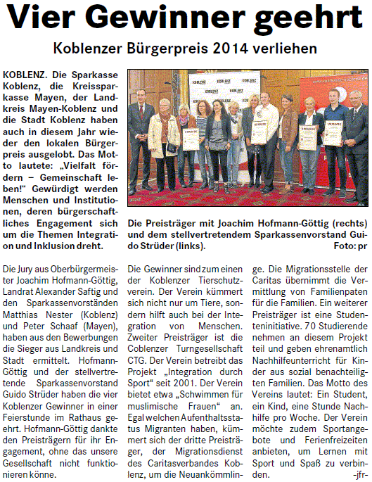 Koblenzer Bürgerpreis 2014 verliehen: Ohne dies bürgerschaftliche Engagement würde unsere Gesellschaft nicht funktionieren, so OB Hofmann-Göttig
