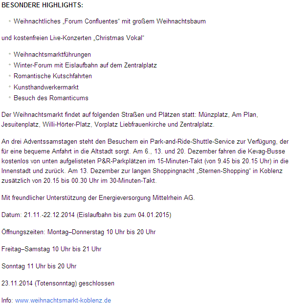 21.11. bis 22.12.2014: Koblenzer Weih-nachtsmarkt 2014 – Eröffnung durch OB Hofmann-Göttig