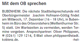 Am Mittwoch, 17. Dezember, ist er von 16.00 bis 18.00 Uhr in Bubenheim im Büro des Ortsvorstehers, Weißenthurmer Straße 5, zu sprechen.