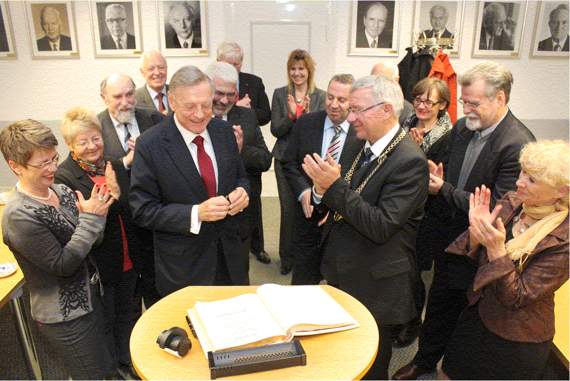 “ Geschafft: Avi Primor (auf dem Foto 5. v.l.) setzte nicht nur seine Unterschrift in das Goldene Buch, sondern schrieb: „Süß und Ehrenvoll ist es das Privileg zu haben sich in dieses Goldene Buch eintragen zu dürfen“. Der Eintrag fand im Rahmen eines Empfangs mit Vertretern aus Politik und Religion statt. “