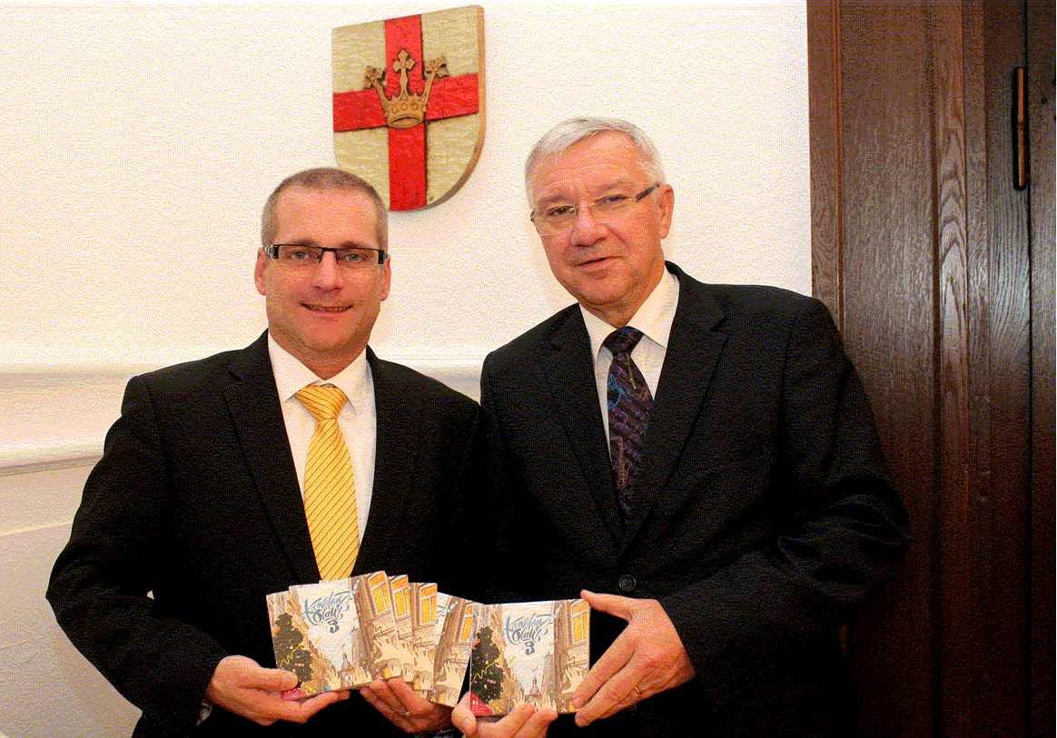 „Wenn in Koblenz etwas zum dritten Mal stattfindet, dann ist es Tradition“, sagte Torsten Schupp (links im Bild), als er Oberbürgermeister Prof. Dr. Joachim Hofmann-Göttig seine neueste Karnevals-CD mit dem Titel „Kowelenz Olau 3“ überreichte. Der OB war sichtlich erfreut über die dritte CD, „weil sie dazu beiträgt, Karnevalslieder aus Koblenz vorzustellen“. Die Bekanntheit Koblenzer Liedguts zu steigern ist aber nicht das einzige Ziel, das Schupp mit der Produktion verbindet. Mit dem Verkauf jeder CD gehen drei Euro an den Kinderschutzbund Koblenz. „Bisher konnte ich schon 7.777 Euro an den Kinderschutzbund überreichen“ erklärte Schupp.
