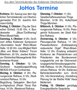Montag 06.10.2014: Auszug aus Terminen von OB Hofmann-Göttig (ansonsten weitere Termine in Koblenz)