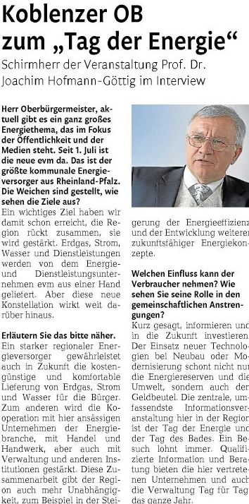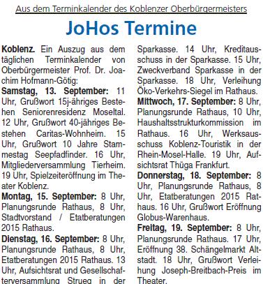 Donnerstag 11.09.2014: Auszug aus Terminen von OB Hofmann-Göttig (ansonsten weitere Termine in Koblenz)