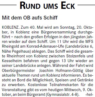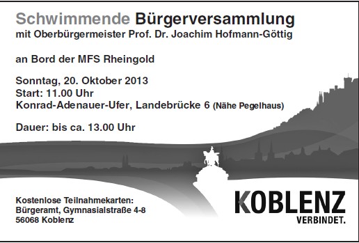 Am Sonntag, 20. Oktober, wird zum 40. Mal in Koblenz eine Bürgerversammlung durchgeführt – nach dem großen Erfolg in den vergangenen Jahren wieder auf dem Schiff. Um 11.00 Uhr wird die MFS RHEINGOLD am Konrad-Adenauer-Ufer, Landebrücke 6 (Nähe Pegelhaus) ablegen.