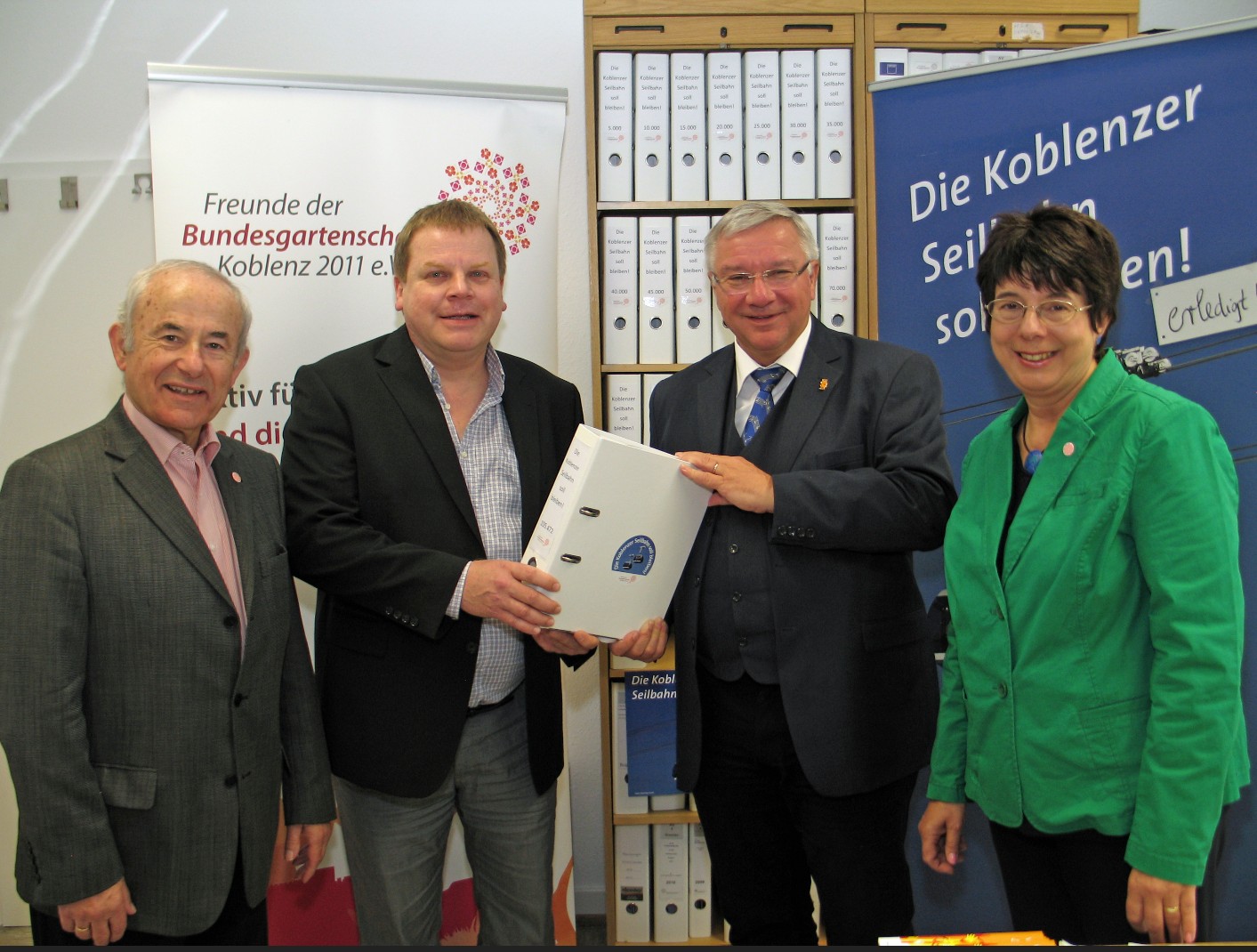 105 472 Unterschriften für die Fortführung des Betriebs der Koblenzer Seilbahn wurden von den BUGA-Freunden im Zeitraum von Ende Sept. 2013 bis zur Entscheidung um Juni 2013 gesammelt. An 30 Terminen waren die BUGA-Freunde mit Ständen in Koblenz und der Region bei den unterschiedlichsten Veranstaltungen präsent. Vereinsmitglieder haben um Unterschriften geworben und sehr viel Informations- und Überzeugungsarbeit geleistet. Unzählige Vereinsmitglieder waren im privaten und geschäftlichen Umfeld unterwegs, um Unterschriften zu sammeln. Unternehmen, Vereine, Verwaltungen, Institutionen wurden angeschrieben, und um Mithilfe gebeten. Die Resonanz war äußerst positiv.