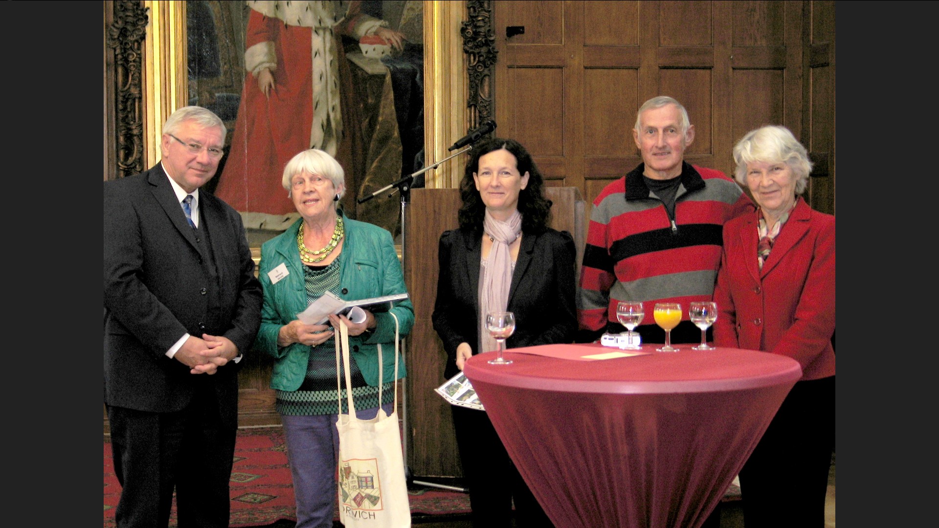 Das Foto vom Empfang im Rathaussaal zeigt von l.n.r.: OB Hofmann-Göttig, Waltraud Jarrold, Präsidentin der “Norfolk & and Norwich-Koblenz Association”, BrigitteFinkemeier, Kultur- und Schulverwaltungsamt, Günter Hahn, Vorsitzender des Freundschaftskreises Norwich-Koblenz – Deutsch-Britischer Club e.V., und Jill Noble, Vorsitzende der “Norfolk & and Norwich-Koblenz Association”. “
