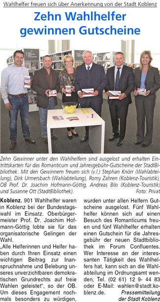 Um dieses Engagement nochmals besonders zu würdigen, wurden unter allen Helferinnen und Helfern Gutscheine ausgelost. Fünf Wahlhelfer können sich auf einen Besuch des Romanticums freuen und fünf Wahlhelfer erhalten einen Gutschein für die Jahresgebühr der neuen Stadtbibliothek im Forum Confluentes.