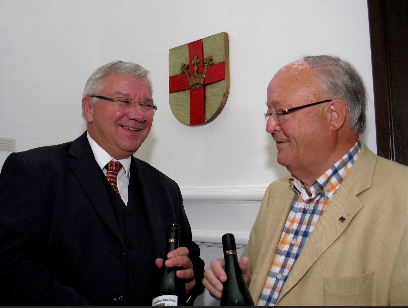Die Städtepartnerschaft zwischen Koblenz und Varaždin ist etwas Besonderes und hat etwas Besonderes: Partnerschaftswein. Der Vorsitzende des Freundschaftskreises Friedhelm Pieper (rechts im Bild) überbrachte Oberbürgermeister Prof. Dr. Joachim Hofmann-Göttig zwei Flaschen der edlen Rarität, deren Trauben im Moselweißer Hamm gewachsen sind und die im Weingut Toni Reif zu einem feinherben Riesling ausgebaut wurden. Pieper wies darauf hin, dass das diesjährige Etikett Fotos der Vorsitzenden der Freundschaftskreise aus Koblenz und aus Varaždin trage. “