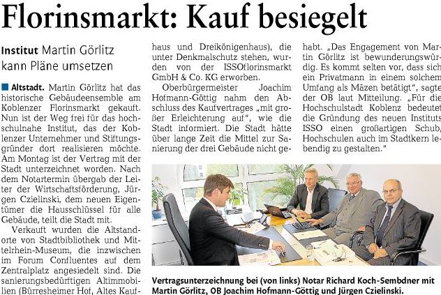 Oberbürgermeister Prof. Dr. Joachim Hofmann-Göttig nahm den Abschluss des Kaufvertrages mit großer Erleichterung auf. Die Stadt hätte über lange Zeit die notwendigen Mittel zur Sanierung der drei herausgehobenen Denkmäler nicht gehabt. „Das Engagement von Martin Görlitz ist bewunderungswürdig. Es kommt selten vor, dass sich ein Privatmann in einem solchem Umfang als Mäzen betätigt“ betont der OB. „Für die Hochschulstadt Koblenz bedeutet die Gründung des neuen Instituts ISSO einen großartigen Schub, Hochschulen auch im Stadtkern lebendig zu gestalten“ so Hofmann-Göttig abschließend. “