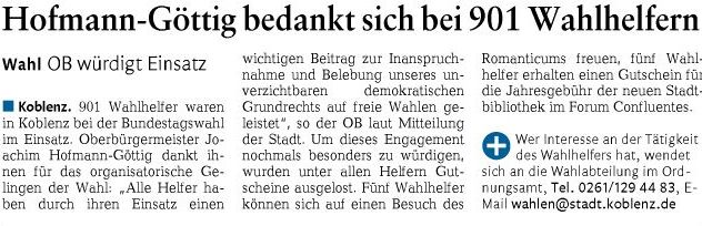 901 Wahlhelferinnen und Wahlhelfer waren in Koblenz bei der Bundestagswahl im Einsatz. Oberbürgermeister Prof. Dr. Joachim Hofmann-Göttig dankt ihnen für das organisatorische Gelingen der Wahl. “Alle Helferinnen und Helfer haben durch Ihren Einsatz einen wichtigen Beitrag zur Inanspruchnahme und Belebung unseres unverzichtbaren demokratischen Grundrechts auf freie Wahlen geleistet”, so der OB.