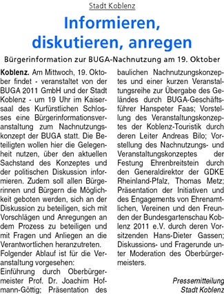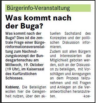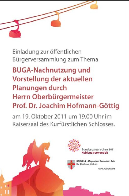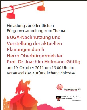 - Bürgerinformation/-beteiligung bei der Umsetzung der BuGa-Nachhaltigkeit für Koblenz, 19.10.2011, 19 Uhr, Schloss