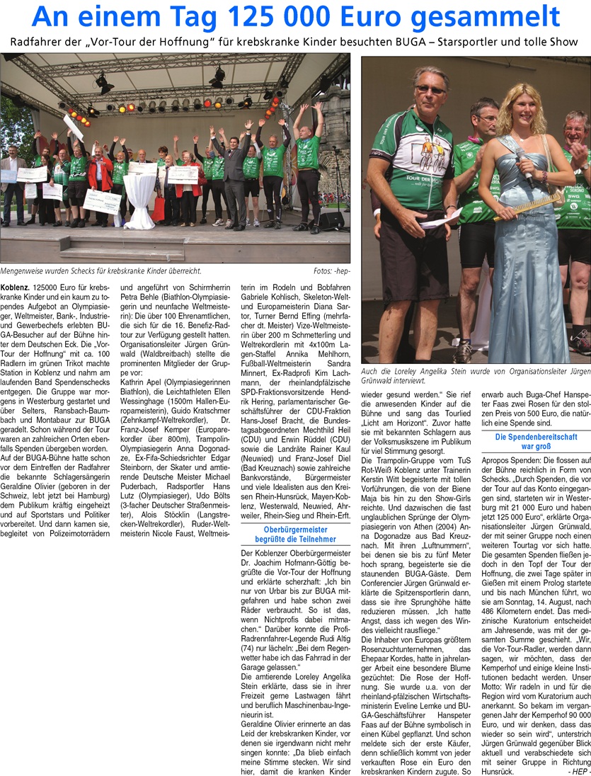 Dann geht es nach Urbar, um eine Benefiz-Etappe bei der Vor-Tour der Hoffnung zugunsten krebs- und leukämiekranker Kinder zur BuGa mit zu radeln. In Koblenz angekommen, beteilige ich mich an einer Talkrunde zugunsten dieser beeindruckenden, unterstützenwerten Aktion mit einem unglaublichen Aufgebot an Promi-Sportlern und –sportlerinnen.