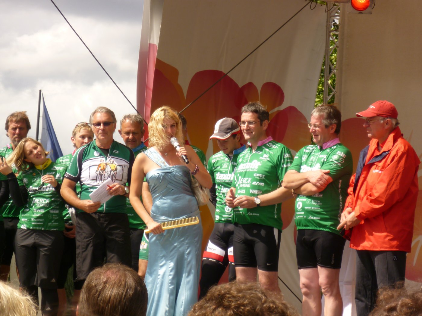 OB Hofmann-Göttig mit u.a. der amtierenden Loreley beim Stopp der Radler/-innen der Benefiz “Vor-Tour” für krebs- und leukämiekranke Kinder auf der BuGa, Koblenz am Deutschen Eck, 08.08.2011