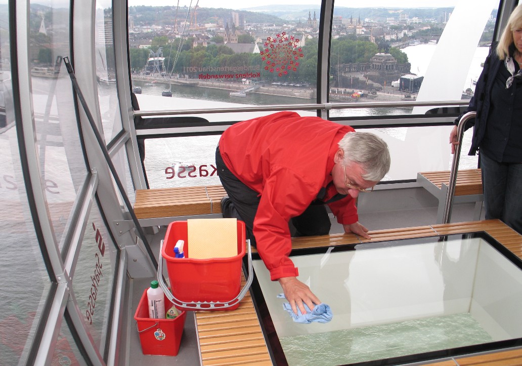 (Koblenz: 12.08.11) Obwohl Oberbürgermeister Prof. Dr. Hofmann-Göttig die Städtewette gegen Almaz und Karlheinz Böhm gar nicht verloren hat, begab er sich heute zur BUGA-Seilbahn, um eine Gondel zu putzen. Der Wetteinsatz des OB bestand eigentlich aus einem Putzeinsatz bei der Werbegondel, die vor dem Rathaus stand. Doch diese Gondel wirbt jetzt wieder auf Messen, so dass nun eine Gondel bei laufendem Betrieb gereinigt worden ist. Der Glastisch in Gondel Nr. 17 wurde von Hofmann-Göttig von allen Fingerabdrücken befreit, der sich nun sorgt, künftig diese Reinigungsleistungen auch in häuslicher Umgebung erbringen zu müssen.