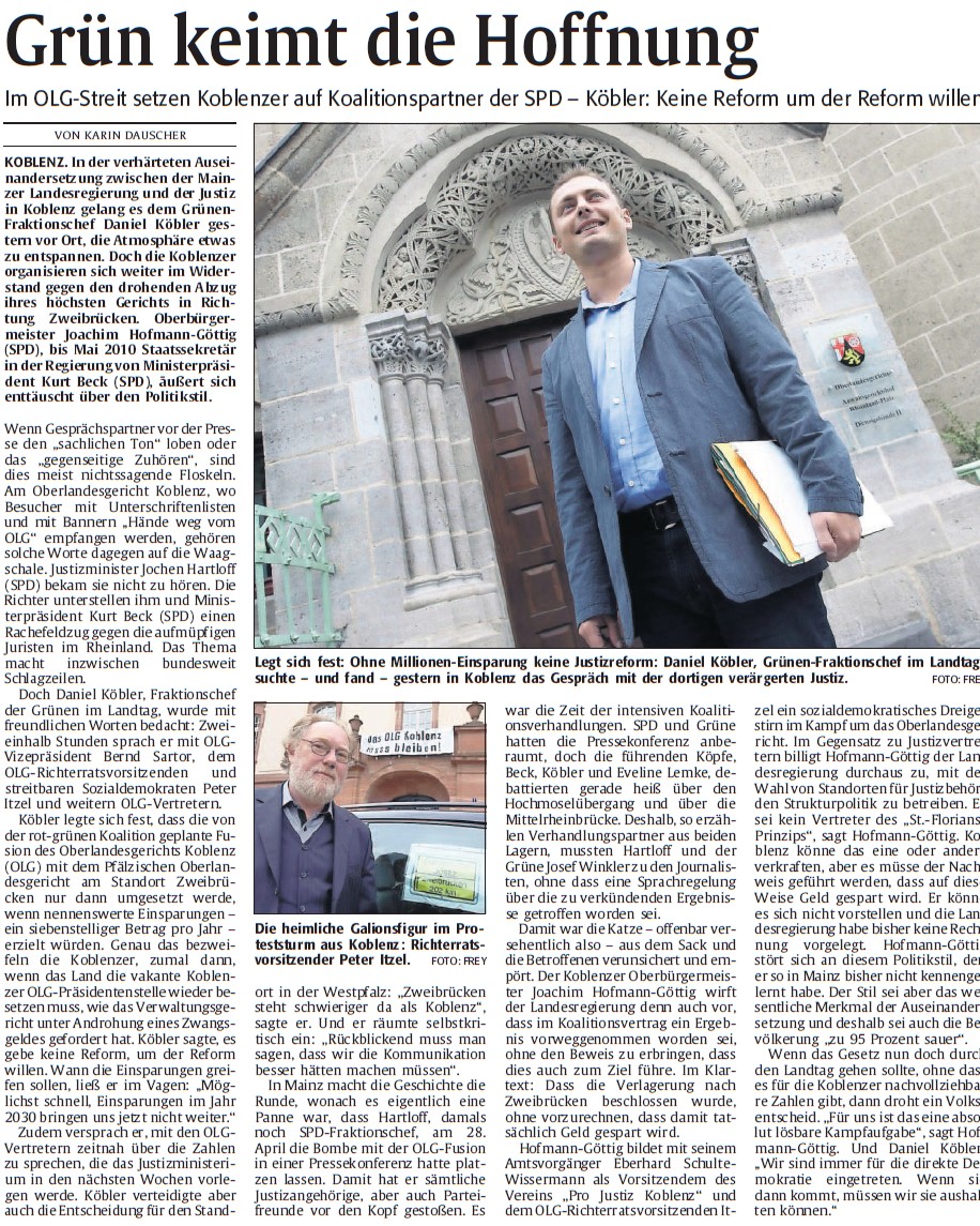 - Neue Entwicklung in der Diskussion um die Verlagerung des Koblenzer Oberlandesgerichts (OLG) und der Generalstaatsanwaltschaft nach Zweibrücken durch Landes-Grünen-Fraktionschef Köbler: Verlagerung komme nur in Frage, wenn jährlich zumindest eine Mio. Euro eingespart würden