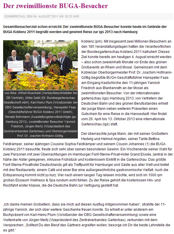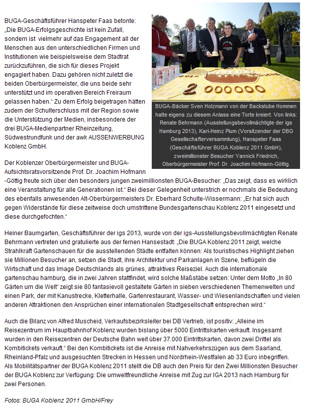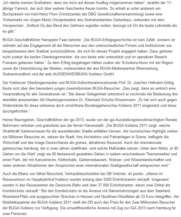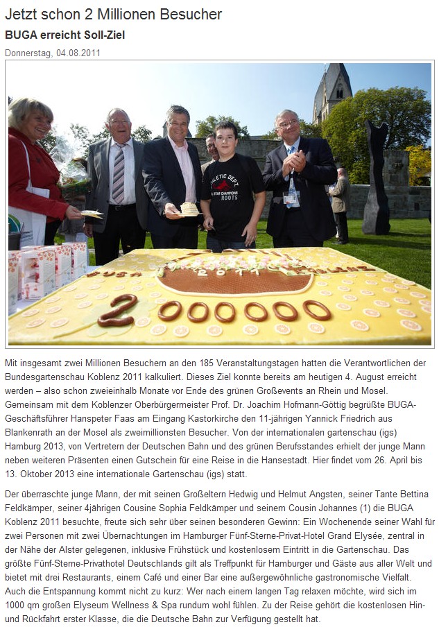 Auszug: Wortlaut der Pressemitteilung der Bundesgartenschau Koblenz 2011 GmbH, 01.08.2011