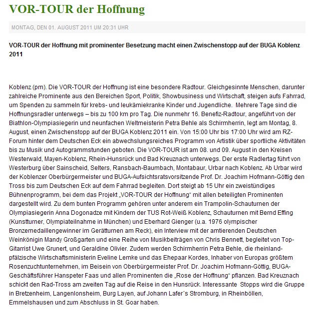 Koblenz (pm). Die VOR-TOUR der Hoffnung ist eine besondere Radtour. Gleichgesinnte Menschen, darunter zahlreiche Prominente aus den Bereichen Sport, Politik, Showbusiness und Wirtschaft, steigen aufs Fahrrad, um Spenden zu sammeln für krebs- und leukämiekranke Kinder und Jugendliche. Mehrere Tage sind die Hoffnungsradler unterwegs – bis zu 100 km pro Tag. Die nunmehr 16. Benefiz-Radtour, angeführt von der Biathlon-Olympiasiegerin und neunfachen Weltmeisterin Petra Behle als Schirmherrin, legt am Montag, 8. August, einen Zwischenstopp auf der BUGA Koblenz 2011 ein. Von 15:00 Uhr bis 17:00 Uhr wird am RZ-Forum hinter dem Deutschen Eck ein abwechslungsreiches Programm von Artistik über sportliche Aktivitäten bis zu Musik und Autogrammstunden geboten.