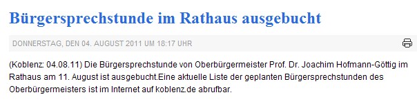 (Koblenz: 04.08.11) Die Bürgersprechstunde von Oberbürgermeister Prof. Dr. Joachim Hofmann-Göttig im Rathaus am 11. August ist ausgebucht.