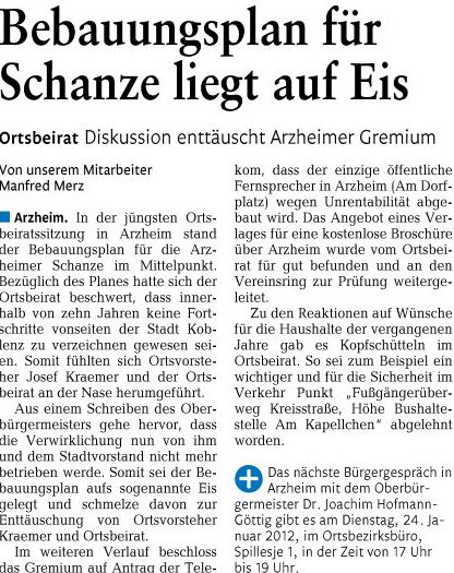 Redaktionelle Bemerkung: Im Artikel bleibt unerwähnt, dass es sich bei der erwähnten Spenden-Kontonummer der Sparkasse Koblenz um das Konto der “JoHo-Schängel-Stiftung” handelt, die von OB Hofmann-Göttig gegründet wurde.