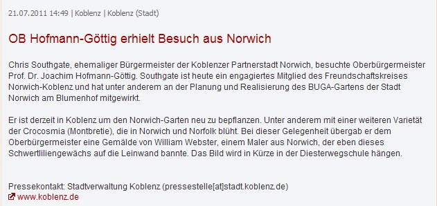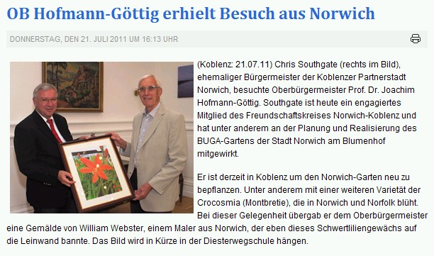 Er ist derzeit in Koblenz um den Norwich-Garten neu zu bepflanzen. Unter anderem mit einer weiteren Varietät der Crocosmia (Montbretie), die in Norwich und Norfolk blüht. Bei dieser Gelegenheit übergab er dem Oberbürgermeister eine Gemälde von William Webster, einem Maler aus Norwich, der eben dieses Schwertliliengewächs auf die Leinwand bannte. Das Bild wird in Kürze in der Diesterwegschule hängen. “