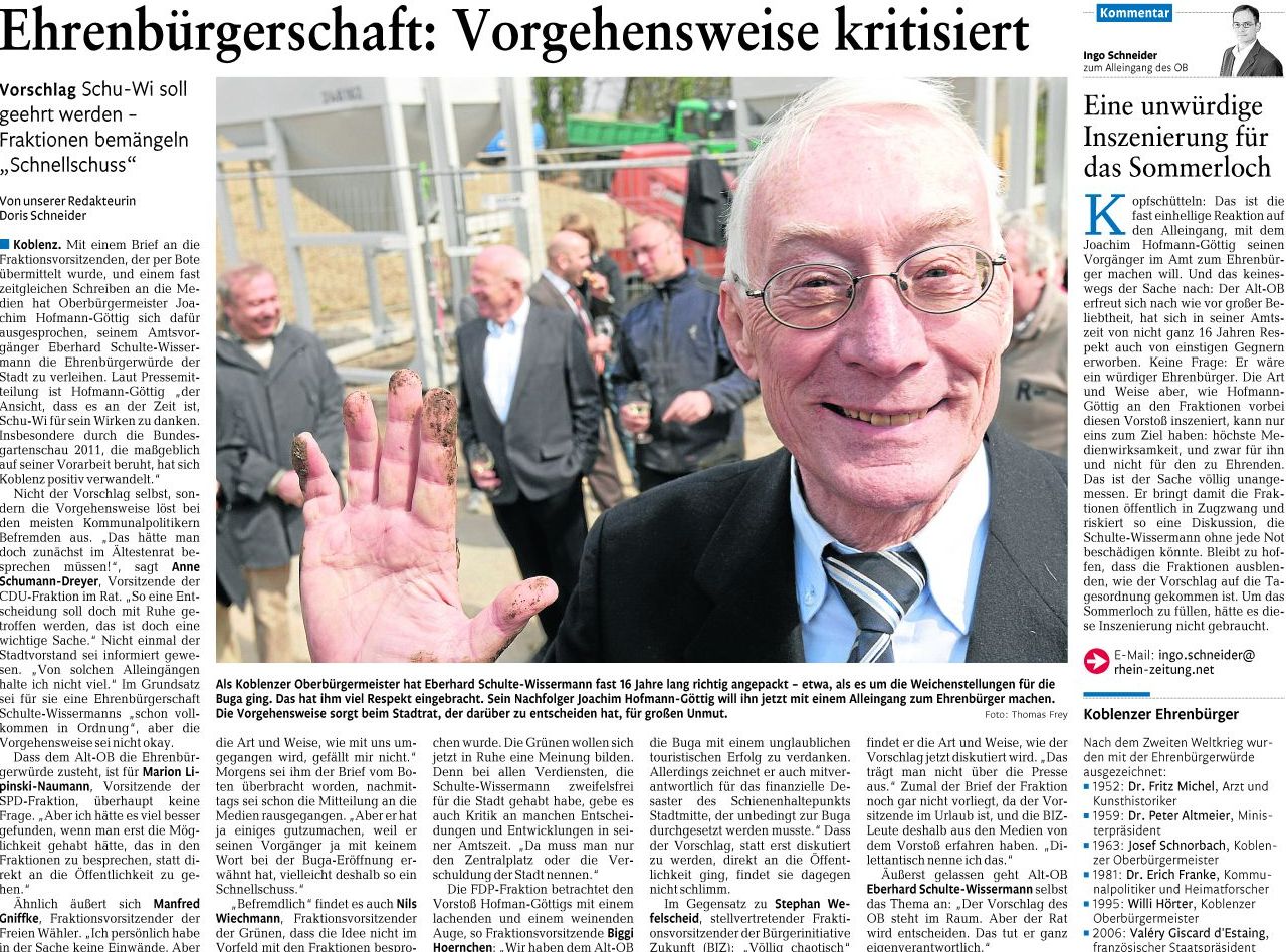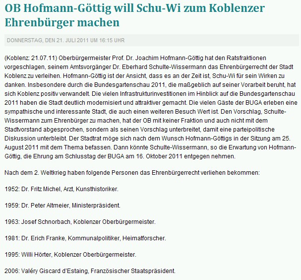 (Koblenz: 21.07.11) Oberbürgermeister Prof. Dr. Joachim Hofmann-Göttig hat den Ratsfraktionen vorgeschlagen, seinem Amtsvorgänger Dr. Eberhard Schulte-Wissermann das Ehrenbürgerrecht der Stadt Koblenz zu verleihen. Hofmann-Göttig ist der Ansicht, dass es an der Zeit ist, Schu-Wi für sein Wirken zu danken. Insbesondere durch die Bundesgartenschau 2011, die maßgeblich auf seiner Vorarbeit beruht, hat sich Koblenz positiv verwandelt. Die vielen Infrastrukturinvestitionen im Hinblick auf die Bundesgartenschau 2011 haben die Stadt deutlich modernisiert und attraktiver gemacht. Die vielen Gäste der BUGA erleben eine sympathische und interessante Stadt, die auch einen weiteren Besuch Wert ist.