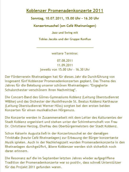Förderverein Rheinanlagen e.V. zum 3. Promenadenkonzert am 10.07.2011, 15 Uhr, Konzertmuschel am Café Rheinanlagen, Koblenz