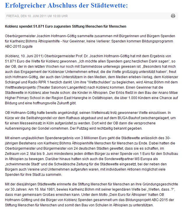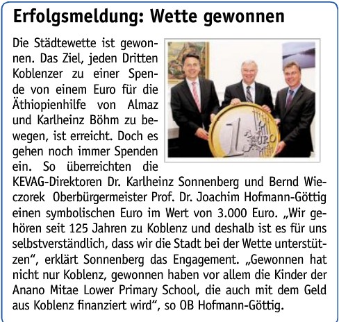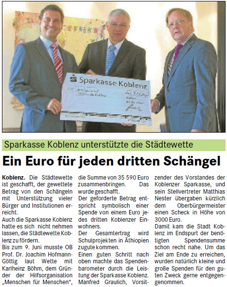 Zur gewonnenen Koblenzer Städtewette der Stiftung “Menschen für Menschen”