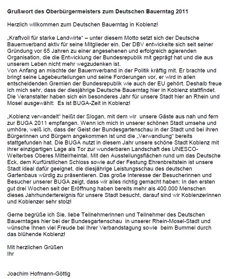 Grußwort von OB Hofmann-Göttig zum Deutschen Bauerntag 2011 (30.06.-01.07.2011) in Koblenz, Mai 2011