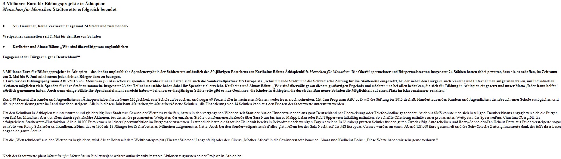 Oberbürgermeister Joachim Hofmann-Göttig sammelte zusammen mit Bürgerinnen und Bürgern Spenden für Karlheinz Böhms Äthiopienhilfe – Nur Gewinner, keine Verlierer: Spenden kommen Bildungsprogramm ABC-2015 zugute