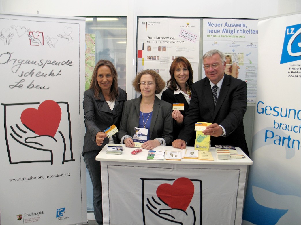 „Jeden Monat nutzen über 7.000 Koblenzerinnen und Koblenzer das vielfältige Dienstleistungsangebot ihres Bürgeramts in der Gymnasialstraße“ machte Oberbürgermeister Prof. Dr. Joachim Hofmann-Göttig deutlich. Hier kann man sich an- und ummelden, Personalausweis und Reispässe beantragen, gelbe Säcke abholen und vieles mehr – ein guter Ort also, um Menschen über ein Thema zu informieren, das alle angeht. Jeder kann in die Situation kommen, ein neues Organ zu benötigen. Und genauso kann im Prinzip jeder Mensch Leben schenken, indem er sich zu einer Organspende nach seinem Tod bereit erklärt. Gerade weil man im Bürgeramt das Thema Organspende nicht erwartet, kann eine Information hier besondere Aufmerksamkeit erzeugen.