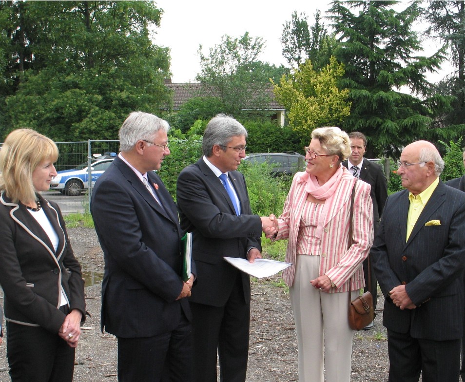 „Jetzt geht es endlich weiter“ war die am häufigsten gehörte Formulierung, die heute an der künftigen Baustelle des Sportplatzes Karthause gefallen ist. Oberbürgermeister Prof. Dr. Joachim Hofmann-Göttig, der den Zuwendungsbescheid über 261.000 Euro für den Sportplatzbau entgegen nahm, gebrauchte sie in seiner Begrüßung ebenso, wie der Minister selbst. Lewentz hob die große Leistung des Sportvereins hervor. So schultert der VfR eine Investition von 365.000 Euro für das Gebäude, für das er eine Zuwendung des Landes von rund 96.000 Euro erhält und weitere 48.000 Euro von der Stadt. Auch die Integrationsleistung des Sportverein war dem Minister Wert bemerkt zu werden. So integriert der Sportverein Zuwanderer, die über den Sport in die Gesellschaft finden.