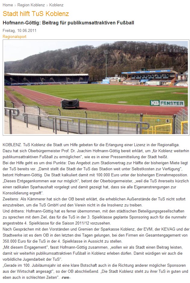 (Koblenz: 10.06.11) Nach dem Verlust der Spielberechtigung in der 3. Bundesliga hat die TuS Koblenz die Stadt um Hilfe gebeten für die Erlangung einer Lizenz in der Regionalliga.