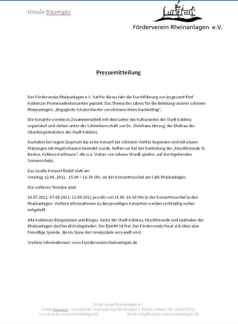 Pressemitteilung des Fördervereins Rheinanlagen e.V. zum 2. Promenadenkonzert am 12.06.2011 (Pfingstsonntag), 15 Uhr, Konzertmuschel der Rheinanlagen, Koblenz 03.06.2011