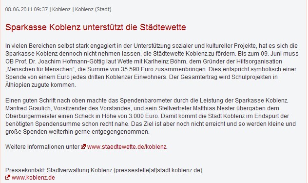 In vielen Bereichen selbst stark engagiert in der Unterstützung sozialer und kultureller Projekte, hat es sich die Sparkasse Koblenz dennoch nicht nehmen lassen, die Städtewette Koblenz zu fördern. Bis zum 09. Juni muss OB Prof. Dr. Joachim Hofmann-Göttig laut Wette mit Karlheinz Böhm, dem Gründer der Hilfsorganisation „Menschen für Menschen“, die Summe von 35.590 Euro zusammenbringen. Dies entspricht symbolisch einer Spende von einem Euro jedes dritten Koblenzer Einwohners. Der Gesamtertrag wird Schulprojekten in Äthiopien zugute kommen.