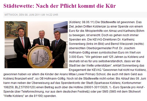 „Gewonnen hat nicht nur Koblenz, gewonnen haben vor allem die Kinder der Anano Mitae Lower Primary School, die auch mit dem Geld aus Koblenz finanziert wird“, so OB Hofmann-Göttig. Noch ist die Städtewette nicht vorbei. Bis Ablauf des 09. Juni kann man neben der Überweisung auf das Spendenkonto der Stadt (Sparkasse Koblenz, Kontonummer: 198259, BLZ:57050120) einen Beitrag auch über die Hotline (09001-30113026, 1,- Euro Spende pro Anruf – Spende über Telefonrechnung, nur aus dem deutschen Festnetz) oder per SMS (SMS mit dem Stichwort “Wette Koblenz” an die 81190) spenden. “