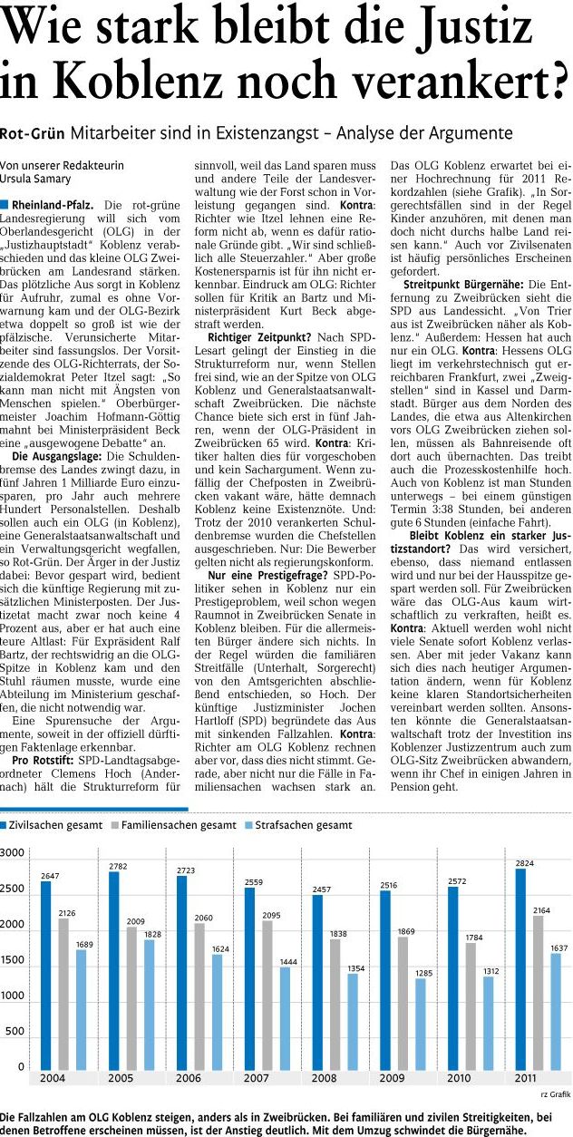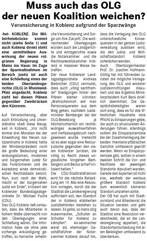 - Zu Medienberichterstattungen über die Verlagerung des größeren Oberlandesgerichts (OLG) aus Koblenz ins kleinere OLG nach Zweibrücken und mögliche Schließung eines Koblenzer Verwaltungsgerichts als ein Gegenstand der Koalitionsvereinbarung der künftigen Rot-Grünen Landesregierung