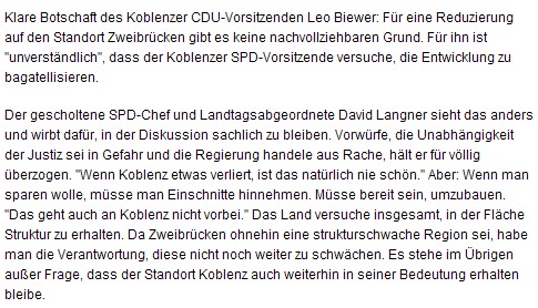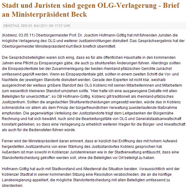 - OB-Maßnahme auf der Basis von Gesprächen mit führenden Koblenzer Justizkreisen gegen mögliche Pläne der zukünftigen Rot-Grünen Landesregierung zur Schließung des Koblenzer OLG und weiteren institutionellen Justiz-Verlagerungen aus Koblenz heraus
