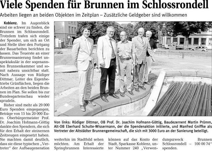 Wer sich ebenfalls für den Erhalt der Springbrunnen einsetzen möchte, kann dies mit einer Spenden tun auf das Konto der Stadt Koblenz bei der Sparkasse Koblenz unter der Nummer 240 “Verwendungszweck Brunnen Schlossrondell – 1000074”. “