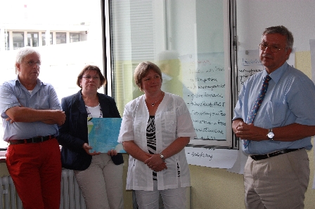 Als Zeichen des Qualifikationsprozesses erhielten die beiden Geschäftsführerinnen Ursula Fetz (2. v.l.) und Claudia Burkhardt eine künstlerisch gestaltete Keramikfliese, die Teil eines wachsenden Gesamtbildes für Weiterbildung ist. “
