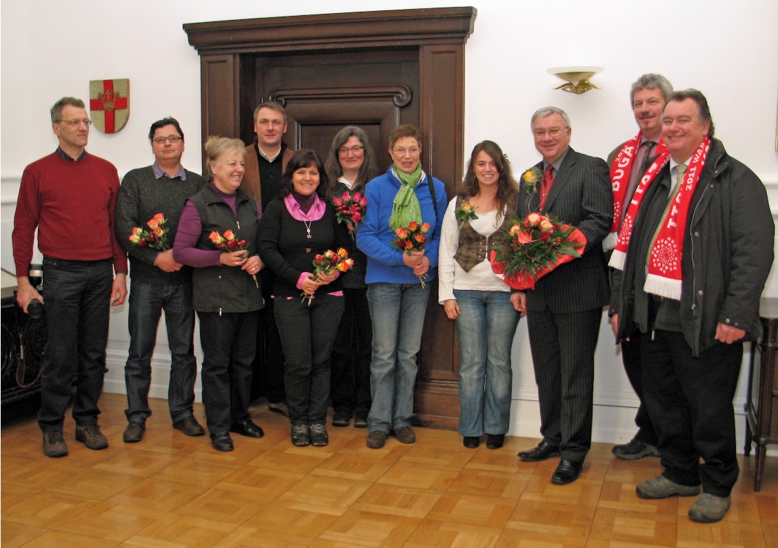 (Koblenz: 10.02.12) Einer jahrzehntelangen und schönen Tradition folgend besuchte die Arbeitsgemeinschaft Koblenzer Gärtner und Floristen angeführt von der Valentine 2012, Sarah Meid (4. v.r.), mit bunten Frühlingsgrüßen den Koblenzer Oberbürgermeister Prof. Dr. Joachim Hofmann-Göttig (3. v.r.). Alljährlich macht die Arbeitsgemeinschaft damit auf den kommenden Valentinstag am 14. Februar – den Tag der Liebenden – aufmerksam. Der OB bedankte sich bei den Gärtnern und Floristen, die im vergangenen Jahr ihren Teil zum tollen Erfolg der Bundesgartenschau beigetragen hatten. “