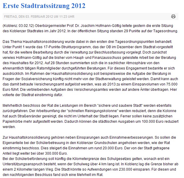 Wortlaut der Presseinformation der Stadt Koblenz, 03.02.2012