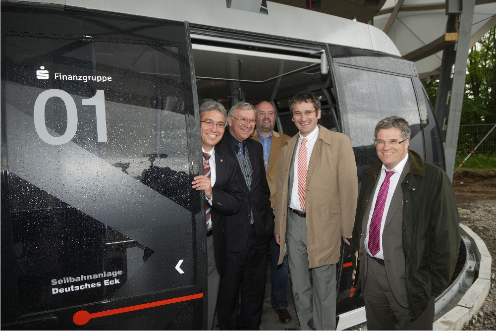 KOBLENZ (pm). Über hohen Besuch freuten sich der neue Koblenzer Oberbürgermeister Prof. Dr. Joachim Hofmann-Göttig und BUGA-Geschäftsführer Hanspeter Faas an der Bergstation der BUGA-Seilbahn: Hendrik Hering, Minister für Wirtschaft, Verkehr, Landwirtschaft und Weinbau, sowie Michael Doppelmayr, Geschäftsführer von Doppelmayr Seilbahnen GmbH, stellten die Bedeutung der Seilbahn als touristischen Anziehungspunkt und ökologisch sinnvolles Transportmittel vor.