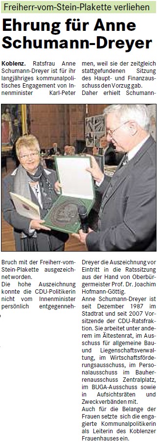Koblenzer Ratsfrau Schumann-Dreyer mit Freiherr-vom-Stein-Plakette aus der Hand von OB Hofmann-Göttig ausgezeichnet