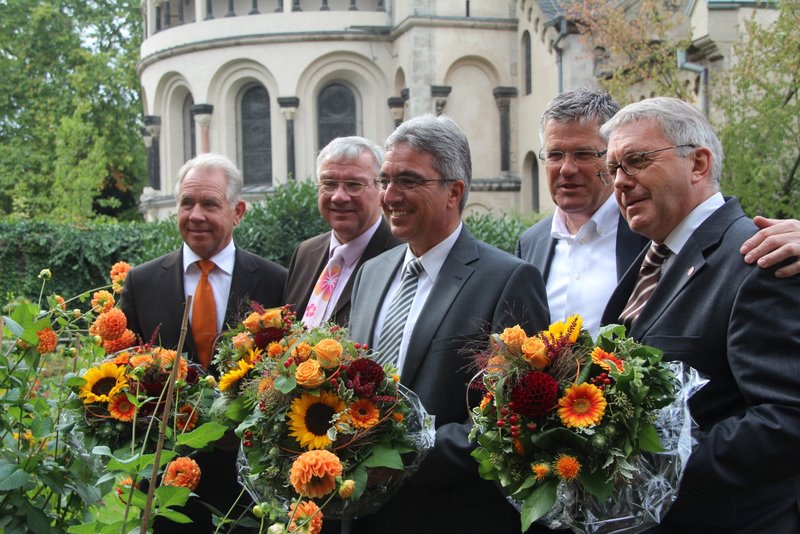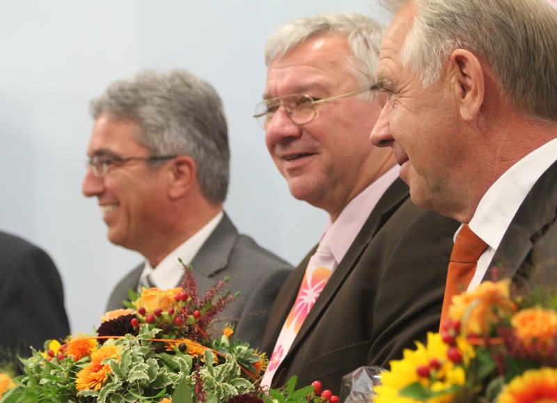 Der Einladung der Bundesratspräsidentin Hannelore Kraft (Ministerpräsidentin NRW) zur offiziellen Feier des 21. Geburtstags der Deutschen Einheit im ehemaligen Bonner Plenarsaal des Deutschen Bundestags folge ich. Der Bundespräsident, die Bundeskanzlerin, der Bundestagspräsident, viele Bundesminister und Ministerpräsidenten sind anwesend und selbstverständlich auch mein Bonner Amtskollege Jürgen Nimptsch. Nach der Begrüßung durch die Bundesratspräsidentin hält der mit 47 Jahren relativ junge Präsident des Bundesverfassungsgerichts Prof. Dr. Andreas Voßkuhle eine mir sehr imponierende, weil sprachlich erfreulich volksnahe, Rede. Auch das Kulturprogramm mit flotter Musik und Tanzdarbietungen sowie die stringente Programmfolge für insgesamt eine Veranstaltungsstunde gefallen mir sehr. Hinzu kommt, dass solche Veranstaltungen Gelegenheit zu Gesprächen geben, die man sonst nicht so ohne weiteres hat. So kann ich mit dem Bundesverteidigungsminister Dr. Thomas de Maizière sprechen, den ich noch aus unserer gemeinsamen Bildungs-Staatssekretärszeit Anfang der 1990er Jahre her kenne (er für Mecklenburg-Vorpommer, ich für Rheinland-Pfalz). Wir hatten schon seinerzeit ein gutes, kollegiales Verhältnis. Er erklärt mir, warum er keine Ausnahme machen kann von seiner Regel, die Bundeswehrstrukturreform nicht mit den betroffenen Oberbürgermeistern und Landräten, sondern nur mit den Ministerpräsidenten zu erörtern. So nutze ich die Gelegenheit zum Gespräch mit Ministerpräsident Kurt Beck.