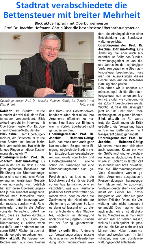 Koblenzer Stadtrat verabschiedete die Bettensteuer mit breiter Mehrheit: Interview mit OB Joachim Hofmann-Göttig