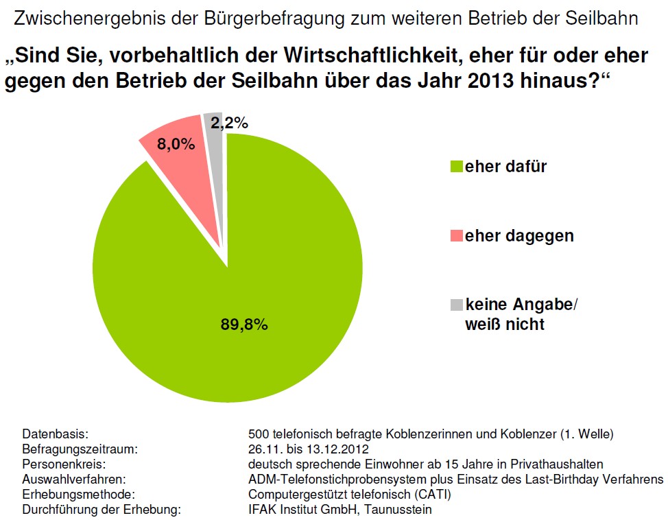 Sowohl dem ICOMOS-Beobachter wie dem Rat verkündete der OB, dass in einer repräsentativen Umfrage, die die Stadt durchführen ließ, ein Zwischenergebnis vorliegt. Auf die Frage ob die Koblenzerinnen und Koblenzer eher für oder eher gegen den Weiterbetrieb der Seilbahn sind, äußerten sich 89,8 % positiv zum Verbleib. (siehe Schaubild)