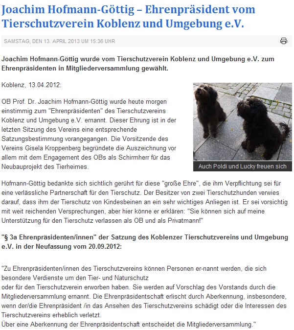 Joachim Hofmann-Göttig nun Ehrenprä-sident vom Tierschutzverein Koblenz und Umgebung e.V.