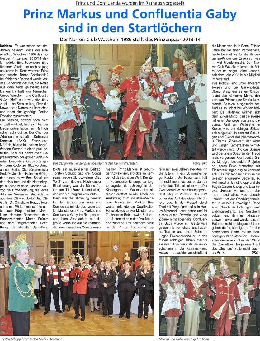 Prinz Markus und Confluentia Gaby im Koblenzer Rathaus vorgestellt – Session 2013/2014 steht unmittelbar bevor
