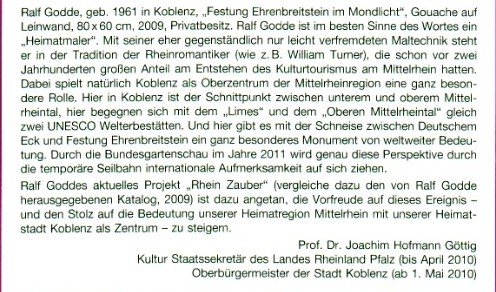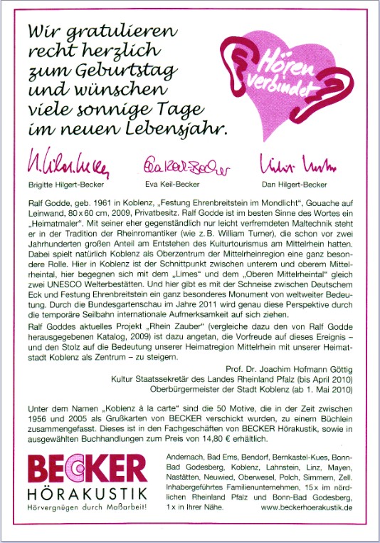 Posted in Aufsätze/Grußworte JoHo by joho Keine KommentareDurch Reproduktionen der Impressionen über repräsentative Koblenz-Motive hat sich die Firma “Hörakustik Becker” mit ihren Grußkarten um das kulturelle Erbe der Stadt Koblenz verdient gemacht. Das nunmehr 55. Motiv ist mit einem Bild des Koblenzer Heimatmalers Ralf Godde erschienen. Als Regierungsbeauftragter für das Weltkultuerbe Oberes Mittelrheintal hat Staatssekretär Prof. Dr. Joachim Hofmann-Göttig ein unterstützendes Begleitwort zur Verfügung gestellt.